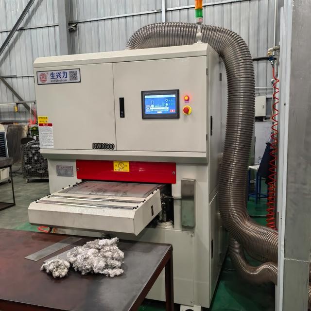 金屬砂光機是一種高效、強力的研磨設備,可以幫助加工零件去毛刺、拉絲、拋光等處理。它主要由機架、砂架、進給機構、吸塵(濕式水磨)和電控系統五大部分構成。在磨削時,被磨板坯從機器右端經過限板裝置和輸送輥推動下,被高速旋轉著的砂帶同時磨削板坯上、下兩面,最后經出料端清除殘存表面的粉塵并送出機器。使用砂光機可以讓你的材料表面變得更加平整光滑,達到工藝要求。